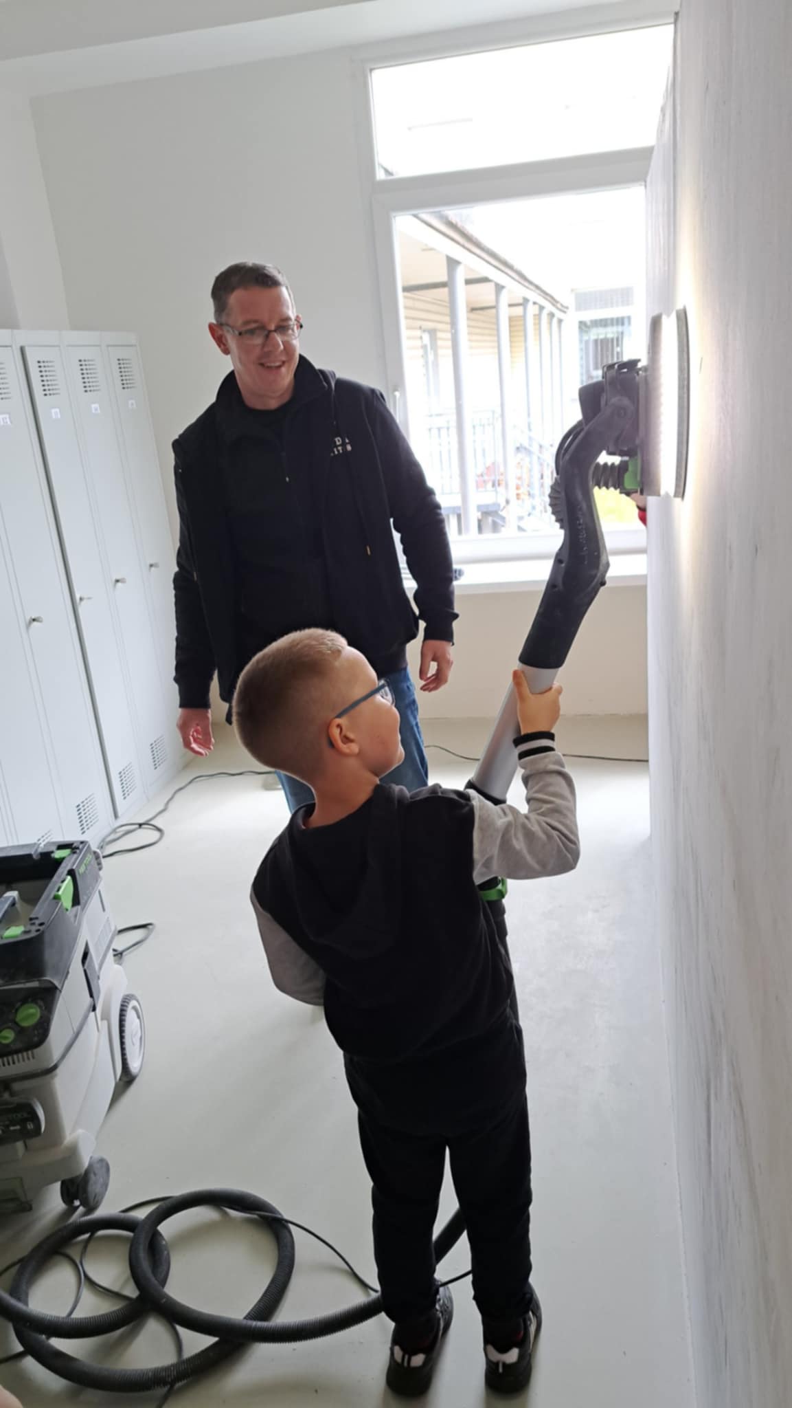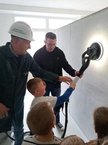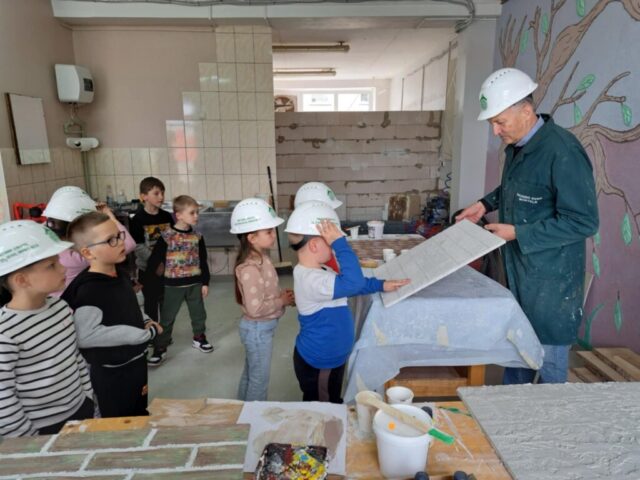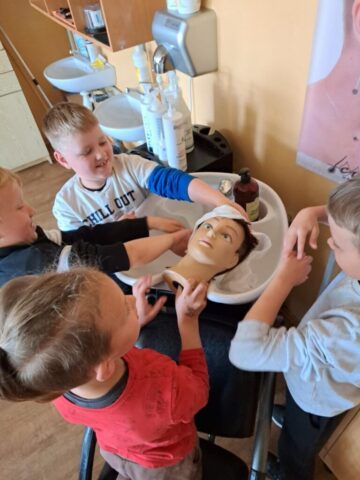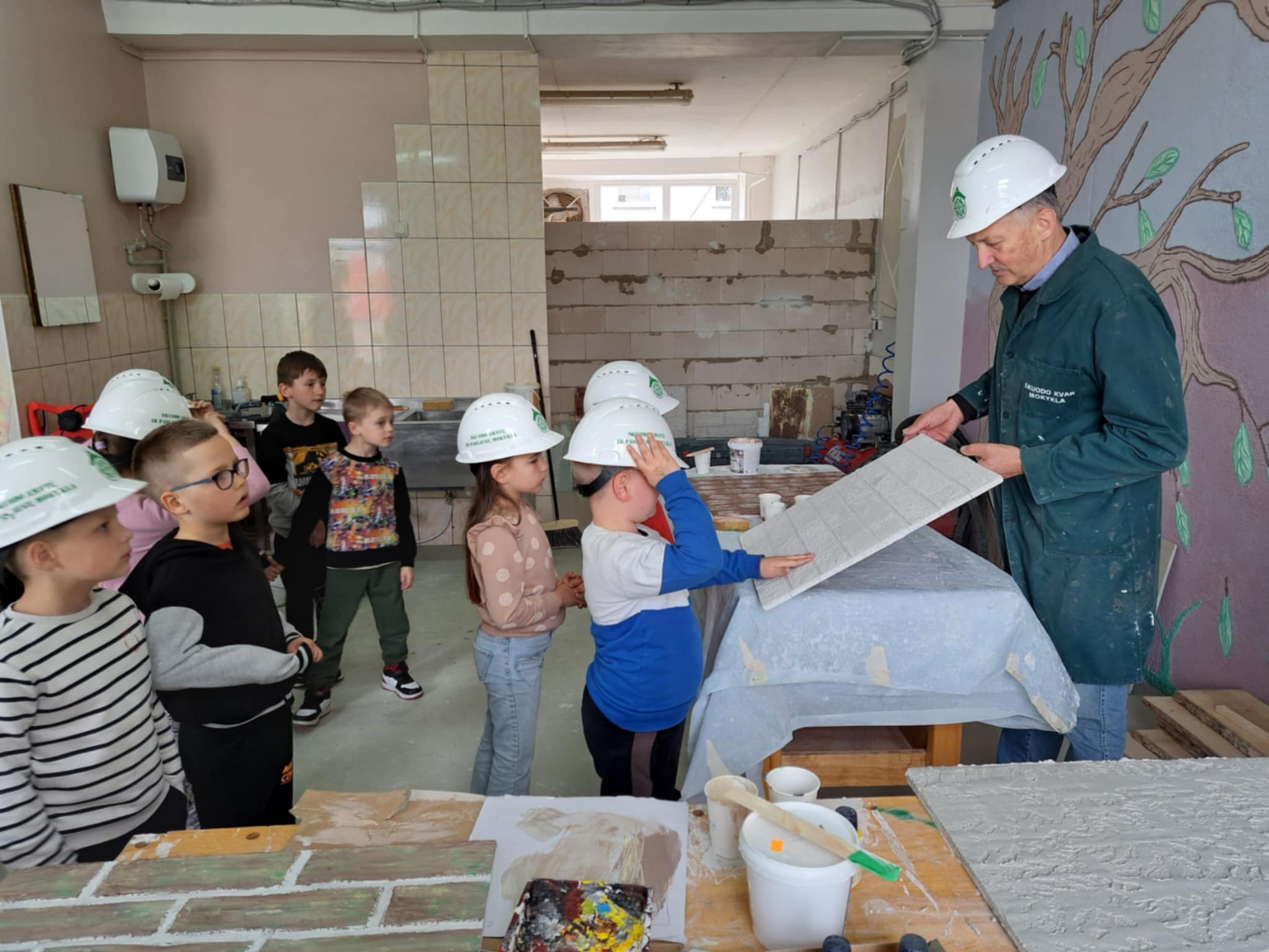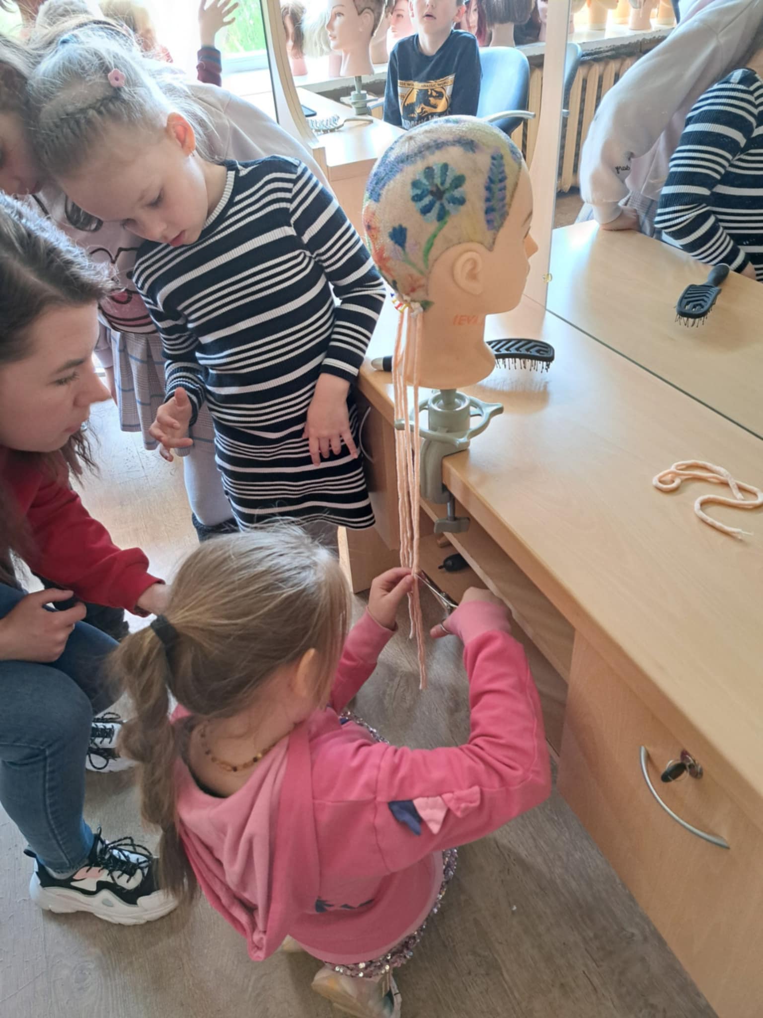 Išklausę trumpo instruktažo apie saugumą, vaikai patraukė iš arčiau susipažinti su tėvelių profesijomis. Vaikai susipažino ne tik su įvairia technika ir priemonėmis, bet turėjo galimybę ir jas išbandyti. Ir ko tik neišbandė : pabandė šlifuoti sienas, klijuoti ir pjaustyti plyteles. Sužinojo kaip laikyti kirpėjo žirkles ir jomis kirpti, net „klientui Petrui“ išplovė galvą.