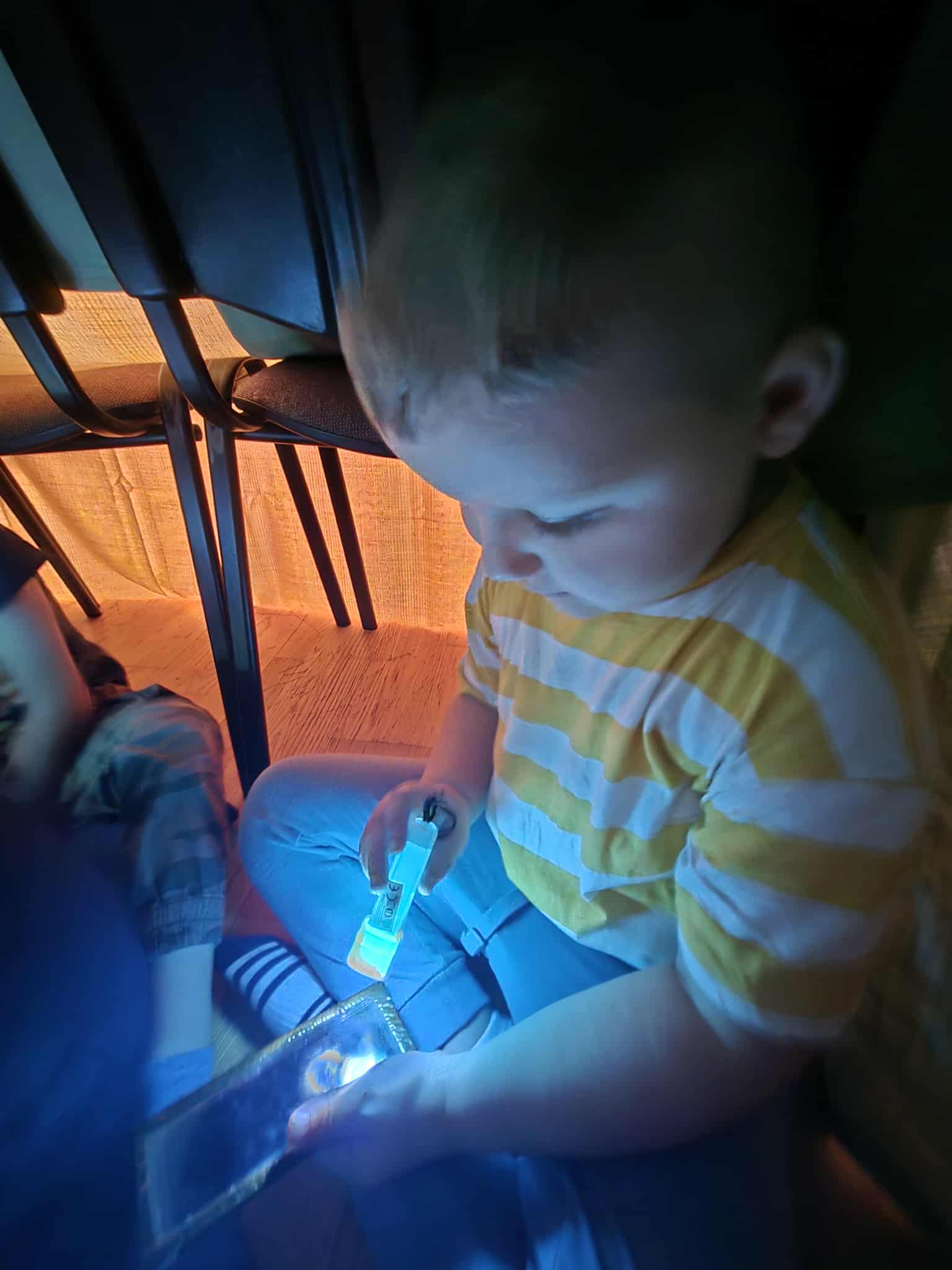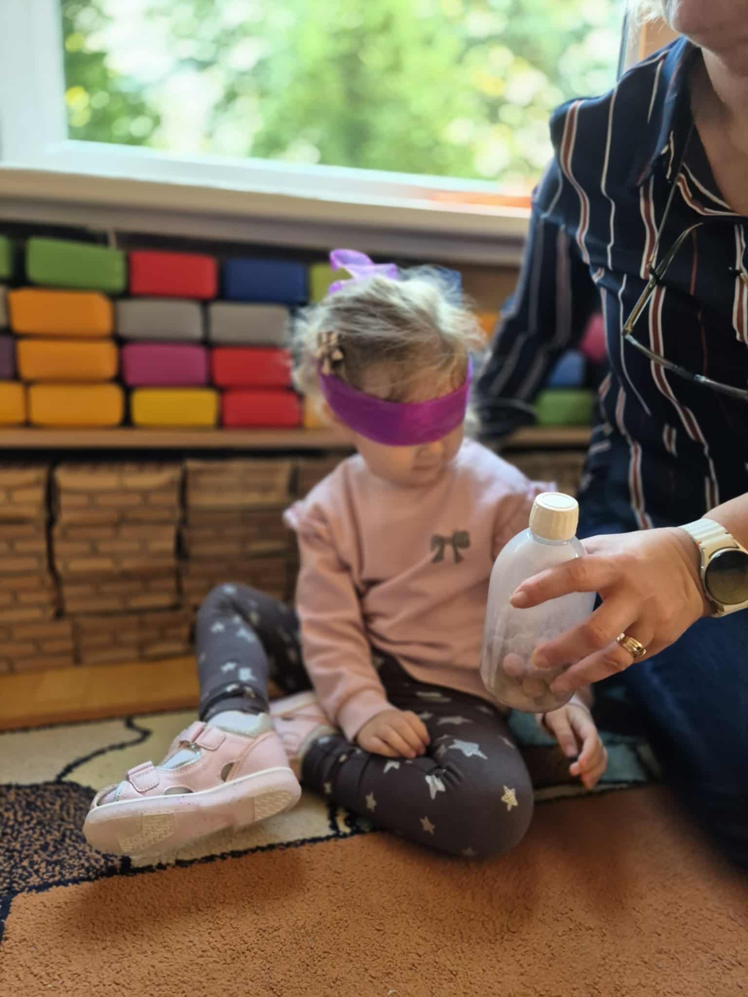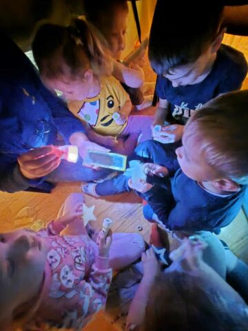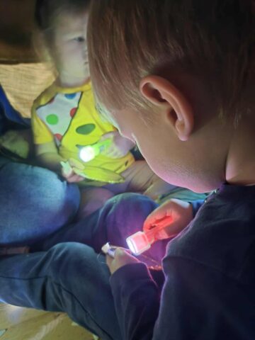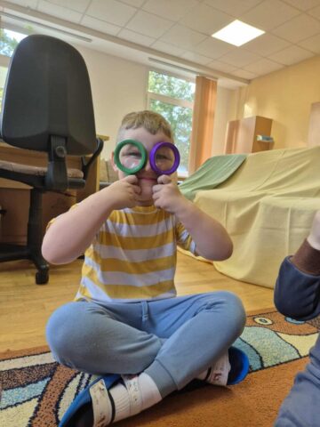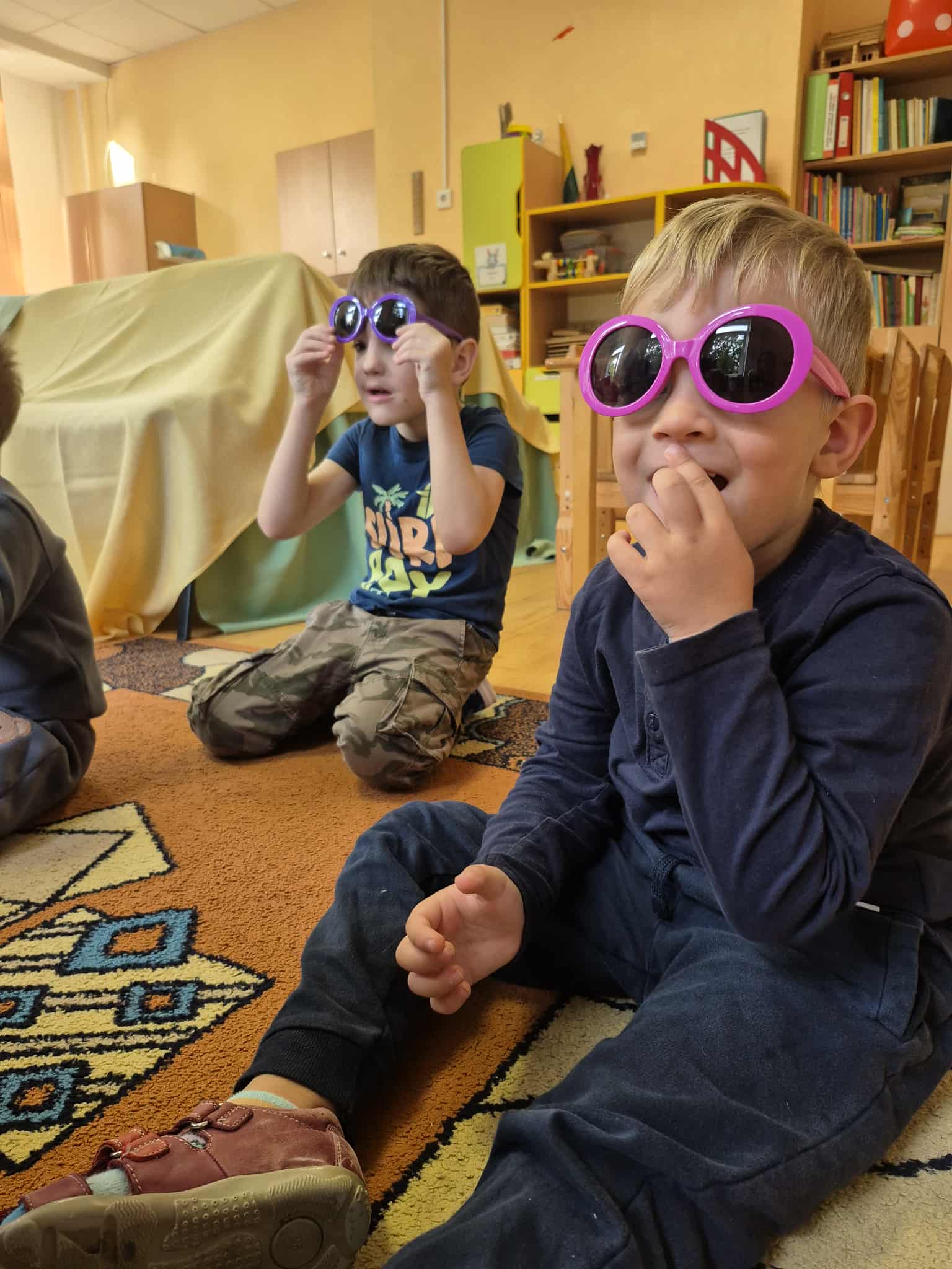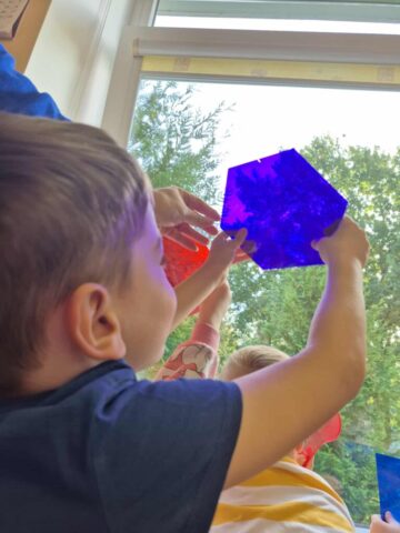 Kad sužinotume kam reikalingos akys – pasistatėm palapinę ir tyrinėjom šviesas. Kėlėm klausimus: ar galim matyti, kai užsidengiam akytes rankomis? Ar būdami su saulės akiniais matome taip pat, kaip ir be jų? O kaip atrodo kiemas, kai į jį žiūrim per spalvotą stiklą?