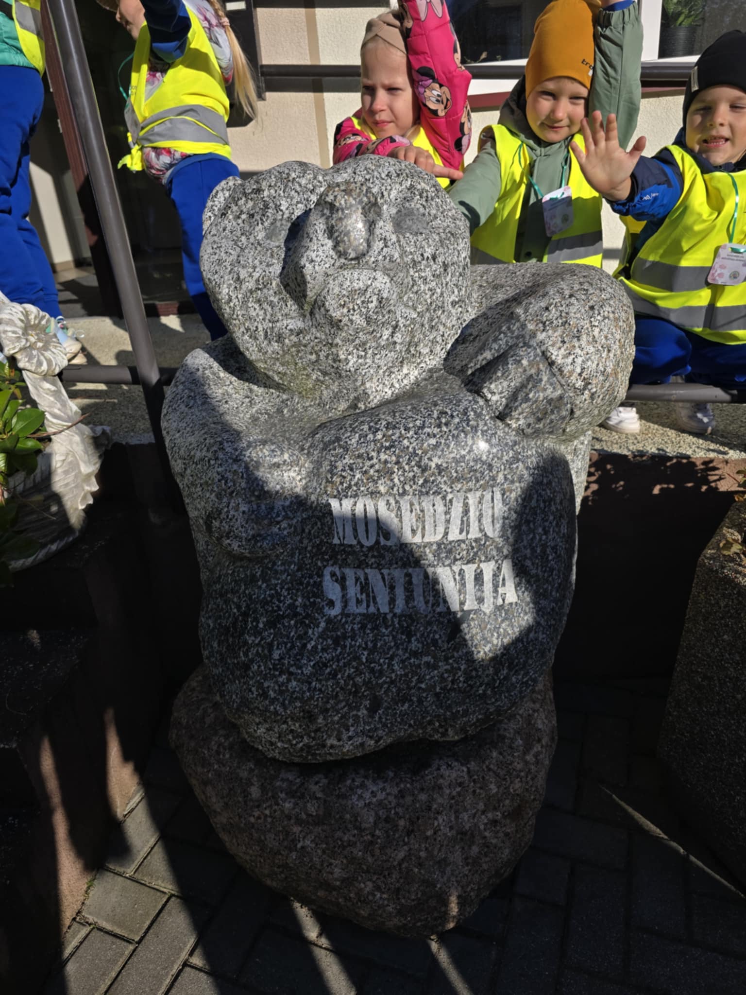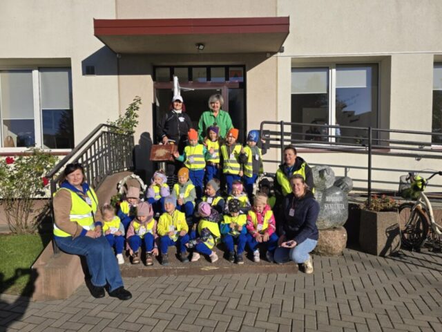 Trys žaismingos keliautojos pasitiko mus, miestelio svečius – ikimokyklinukus, Mosėdžio centre ir… pažintinė -orientacinė kelionė prasidėjo. Mosėdiškiai savo miestelį žino, kaip penkis pirštus, todėl lydimi turistės Laimos (mokytoja Laima Bernotienė)…ir trankios muzikos, ryžtingu žingsniu žygiavome akmeningomis gatvėmis. Pirmiausia aplankėme Mosėdžio seniūniją, ir susipažinome su seniūne Regina.