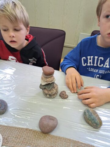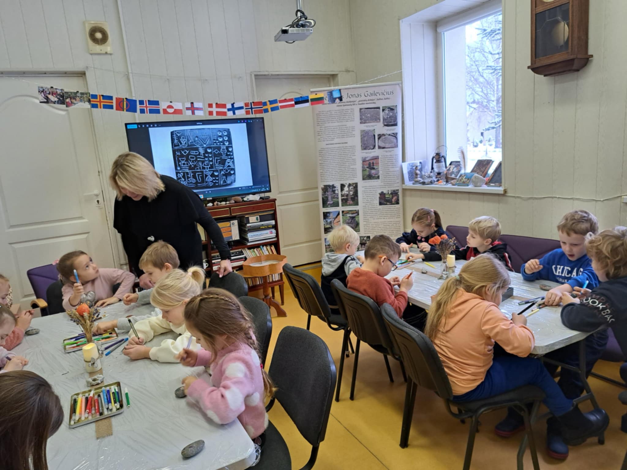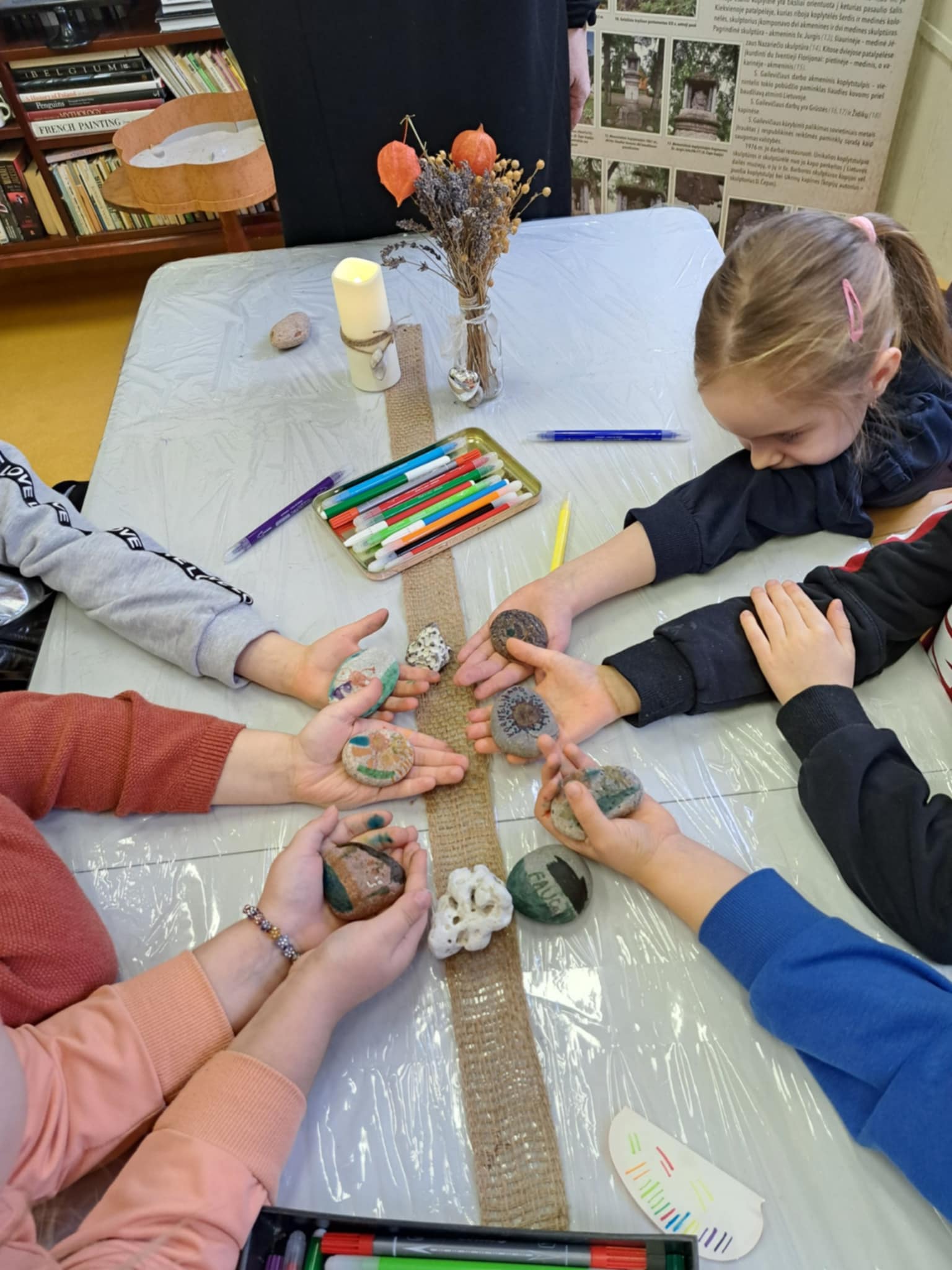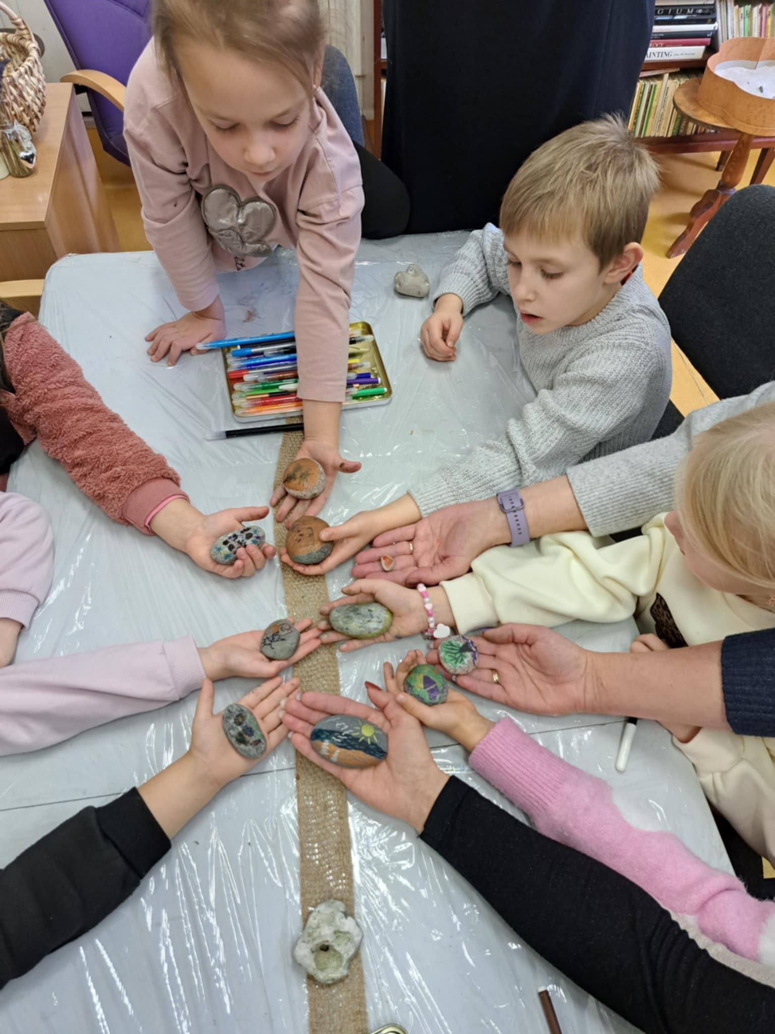 Jaukioje Ukrinų bibliotekoje bibliotekos vedėja Valda supažindino vaikus su įvairių formų akmenukais, papasakojo, kaip gimsta skulptūros, kaip meistrai dirba su akmeniu, ir parodė, kad net mažiausias akmenukas gali tapti meno kūriniu. Įkvėpti pasakojimų, vaikai ėmėsi darbo – dekoravo akmenukus, spalvino, kūrė raštus ir piešinius, kuriuose žaidė jų fantazija. Kiekvienas akmenukas tapo vis kitoks, vienas už kitą gražesnis, o vaikai su pasididžiavimu rodė savo kūrinius draugams.
