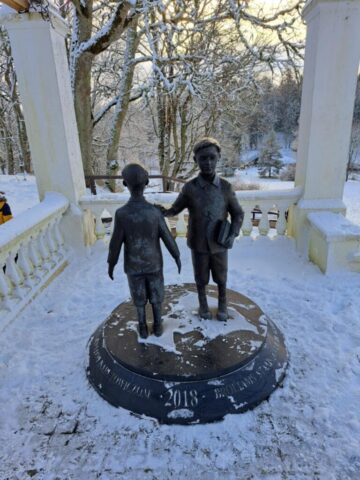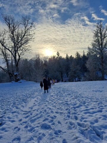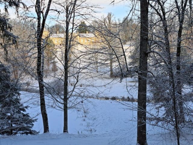 Kupini kūrybinio įkvėpimo važiavome toliau – į nuostabųjį Renavo dvarą. Jį pasiekus mus pasitiko įspūdinga žiemiška parko ramybė. Apėjome visą dvaro teritoriją: žavėjomės dangų siekiančia Renavo egle, kvėpavome tyru parko oru, o didžiausią vaikų susižavėjimą sukėlė garsusis akmuo su milžino pėda – apie jį netrūko nei spėlionių, nei fantazijų. Vieni tvirtino, kad čia tikras milžinas buvo užklydęs, kiti juokavo: „Gal jis dar čia pat?“