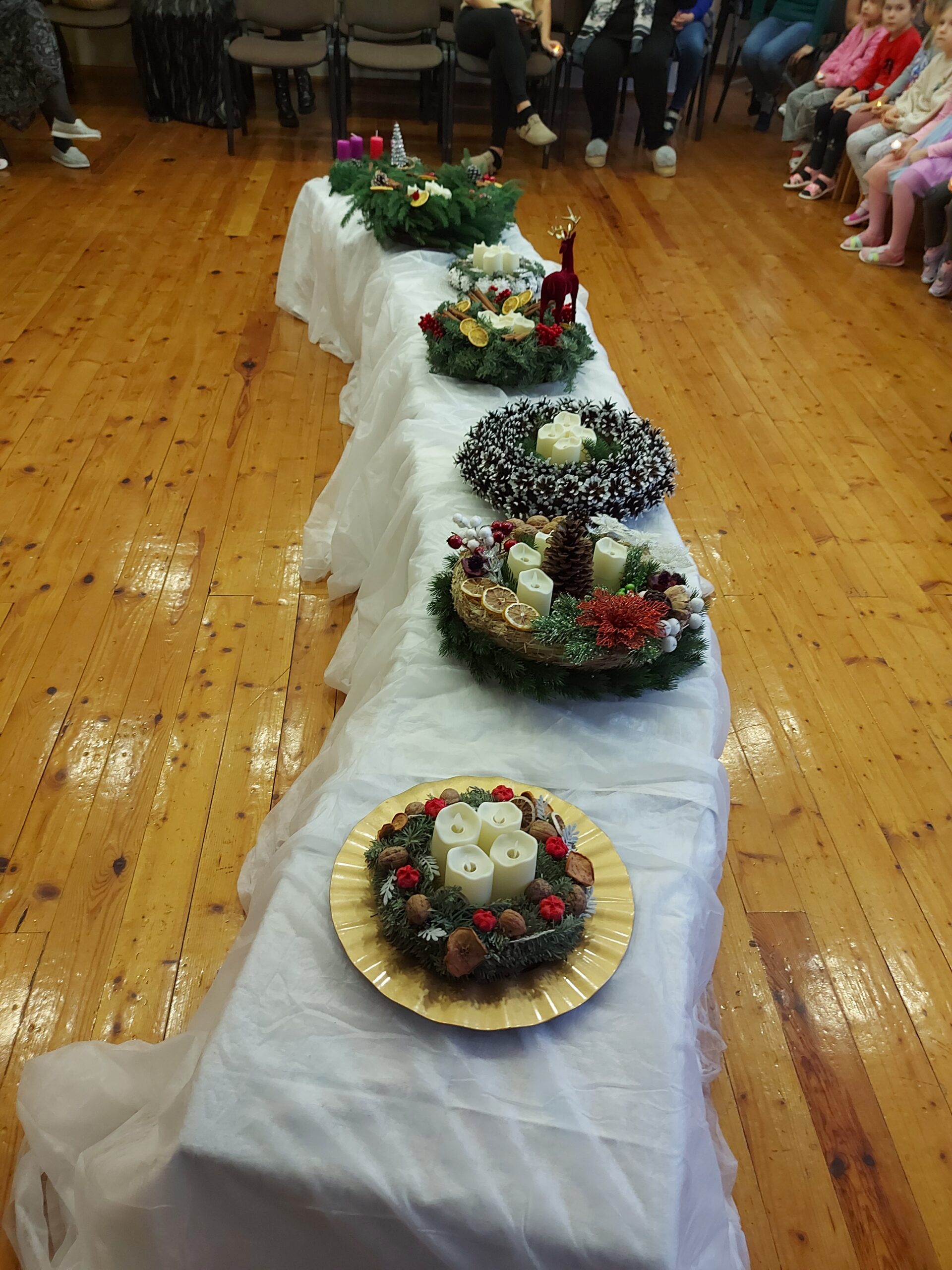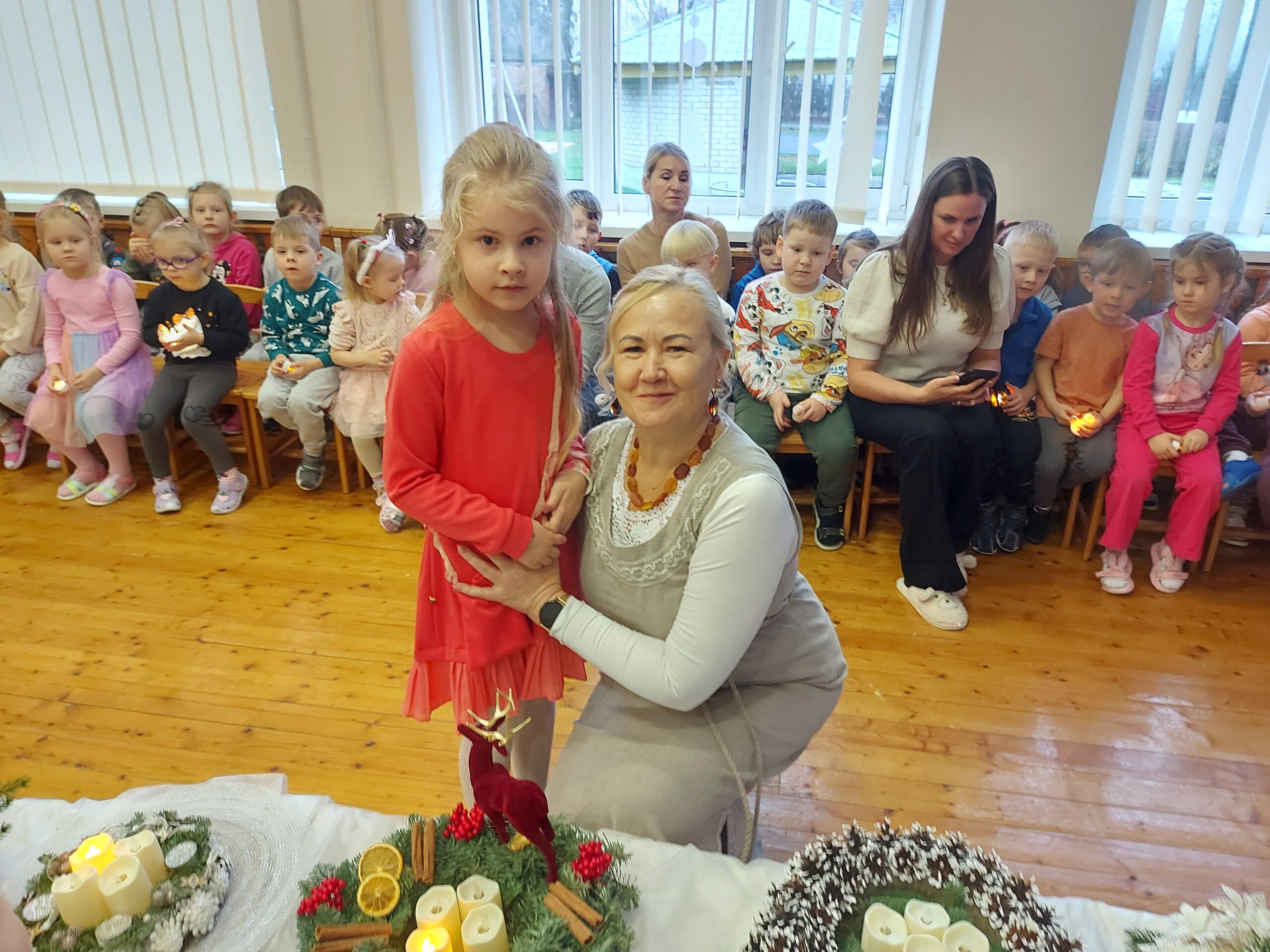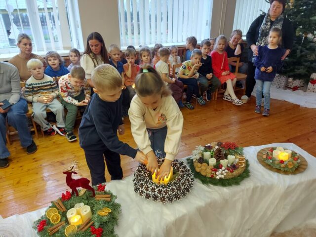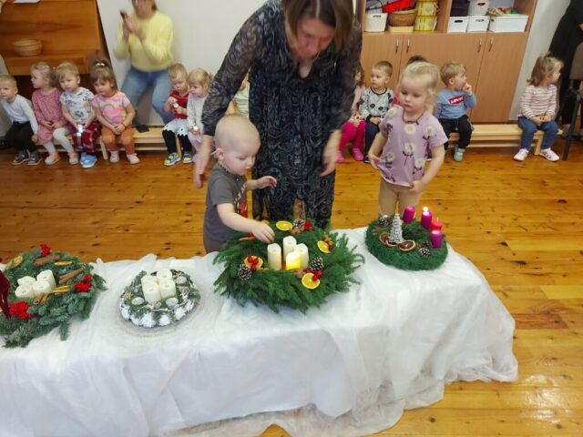 Advento vainikas su keturiomis žvakėmis yra tarsi kelias, vedantis per laukimą į šv. Kalėdų šviesą. Vyresniųjų grupių  vaikai padainavo dainelę  „Žvaigždelė“. Mokytojos kartu vaikais sudėjo savo Adventinius vainikėlius ant paruošto balto stalo. Pirmoji Advento žvakė – Vilties žvakė, kurią uždegė  mūsų lopšelio-darželio direktorė. Kiekvienos grupės atstovai – vaikai, su mokytojų pagalba uždegė po pirmąją savo vainiko žvakę. Kiekviena naujai įžiebta žvakė atneš vis daugiau šviesos – taip, kad Advento metu pamažu šviesėja ir mūsų visų širdelės. Kartu su muzikos mokytoja Daiva Mockiene visi padainavo dainelę  „Žvakelė naktyje“. Vedančiosios pakvietė stebėti lopšelio-darželio direktorės, pavaduotojos ugdymui Simonos Jurčės ir „Saulutės“ korpuso vaikų paruoštos  staigmenos – filmuko.