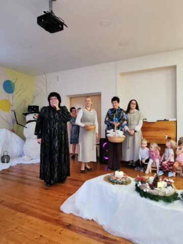 Lopšelio-darželio direktorė visus pasveikino su advento pradžia, visoms grupės įteikė kūčiukų ir pakvietė išsitraukti advento kalendoriaus numeriuką – kur visų lauks staigmena.